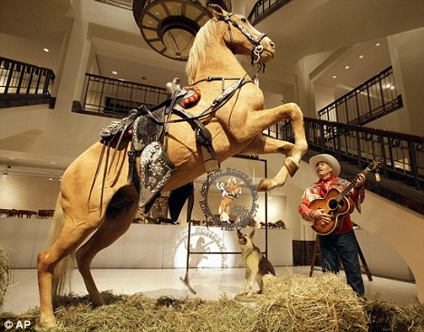 In the photo above one sees Trigger, not only stuffed, but arranged in mid-rearing, his front hooves high in the air. Oh it’s just not right! And look! There is the background is a mannequin dressed like Roy Rogers! Cowboy hat! Little cowboy suit! He has a guitar! He’s singing to his taxidermed horse which is causing the horse to startle in terror! Oh the whole thing is absolutely ghastly! Is it possible to be an animal torturer after death? Is this story related in any way to Mel Gibson?