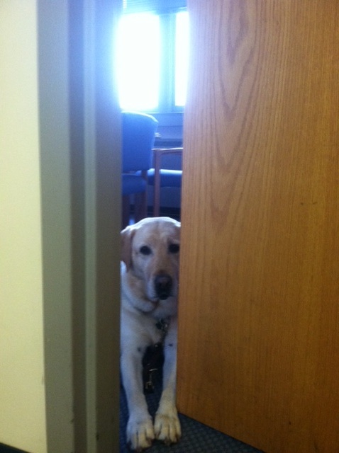Nira, ever loyal, looks out the door of my new office in the Renee Crown Honors Program at Syracuse University.