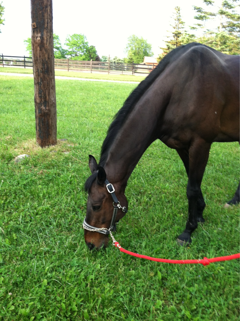 If you were deaf you could work in the blacksmith’s shop. The photo below depicts my wife’s horse “Luigi” who is an ex-racehorse. He’s a dark “bey” chestnut colored thoroughbred who has a very long neck. He’s eating grass on a summer’s day. In the old days, he’d have had a blind friend to braid his mane. He might have had a hunch backed girl to clean his hooves.