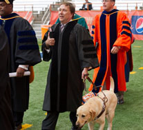 Photo: Professor Stephen Kuusisto and guide dog Nira marching in academic convocation at Syracuse University.