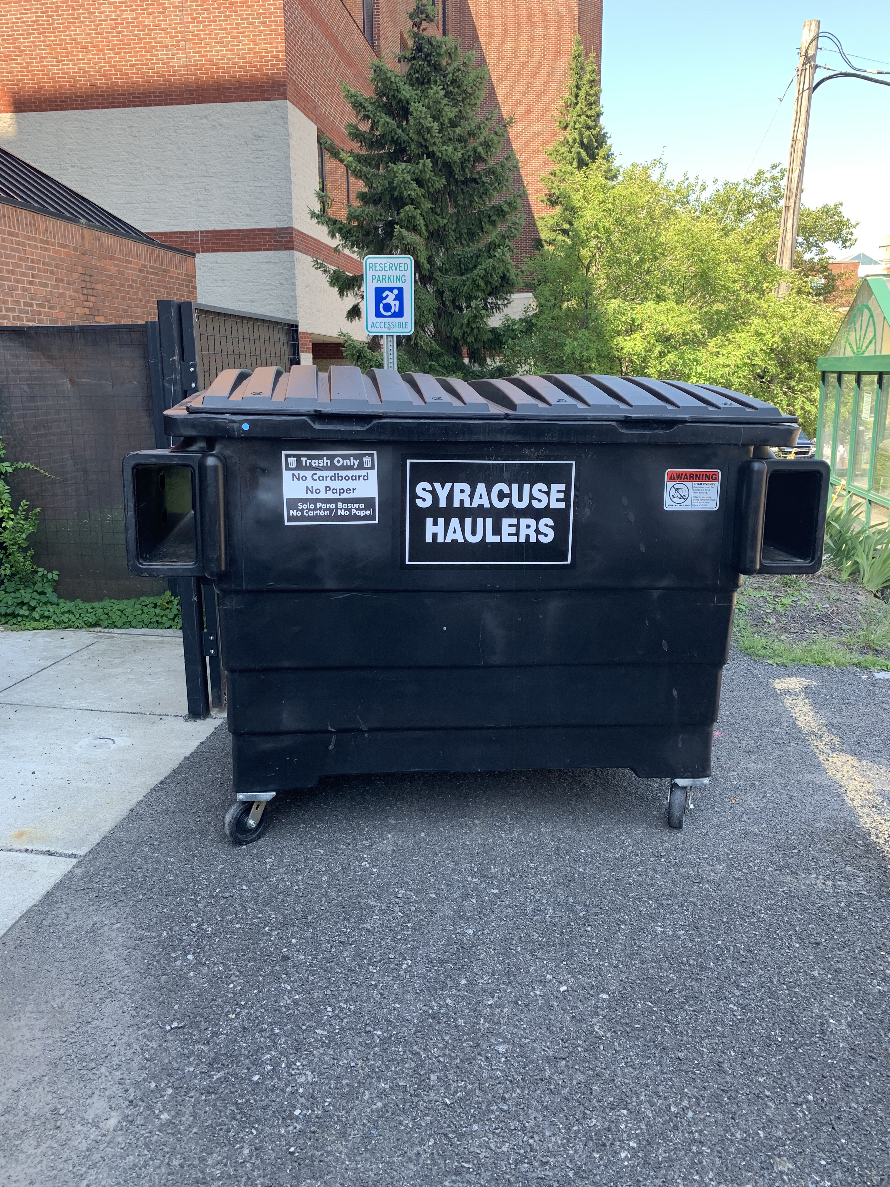 It is perhaps ironic when a blind person says a picture is worth 1000 words. I studied poetry in graduate school and have built my life around a deep affiliation with language. Nonetheless here is a photograph which may defy customary language. We’re talking about the Americans with disabilities act at 30. This photo shows a large trash dumpster outside the central administration building of Syracuse University. The dumpster is located in a disability parking spot.