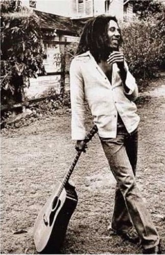 Photo description: black and white photo of a smiling Bob Marley. He’s standing outside and almost appears to be leaning on a guitar, the neck of which he’s holding in his right hand.