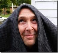 Photo: Stephen Kuusisto with a dark suit jacket over his head, his face showing, eyes rolling and “cat who ate the canary” smile.
